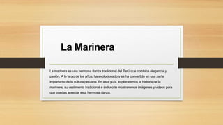 La marinera es una danza tradicional peruana que se originó en el siglo XIX como una celebración de los marineros. Se baila con trajes que reflejan la cultura peruana, como faldas bordadas y sombreros de marinero. La música de la marinera combina ritmos afro-peruanos, europeos y andinos con instrumentos como la guitarra y el cajón.