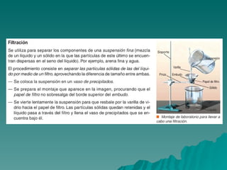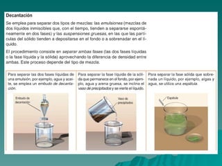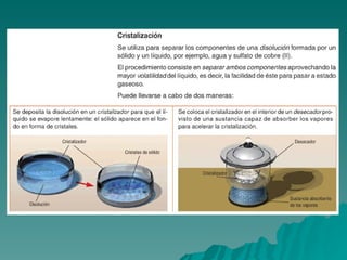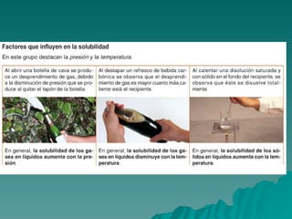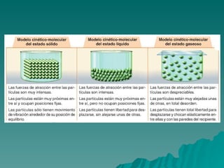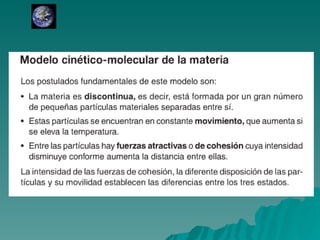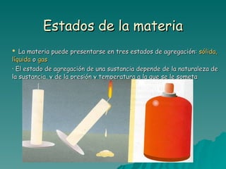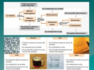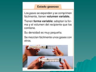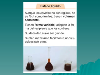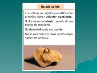 Este documento trata sobre los diferentes estados de la materia, incluyendo sólido, líquido y gas, y las propiedades asociadas con cada estado. También discute los cambios de estado como la evaporación y ebullición, y define conceptos como soluto, disolvente y saturación en el contexto de las disoluciones. Finalmente, distingue entre elementos y compuestos químicos.