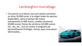 El documento describe varios modelos de superdeportivos de Lamborghini y Ferrari, incluyendo especificaciones y características clave. Se mencionan vehículos como el Lamborghini Murciélago, Veneno, Centenario y Huracán, así como Ferraris como la LaFerrari, F430, Enzo, F812 y otros.
