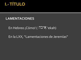 Este documento resume el libro bíblico de Lamentaciones. Explica que se atribuye tradicionalmente a Jeremías, que describe la destrucción de Jerusalén por los caldeos en 587 a.C. a través de cinco poemas en forma de acróstico. Combina elementos sacerdotales, proféticos y de sabiduría al expresar el dolor del pueblo y reconocer que el desastre fue un juicio de Dios por el pecado, aunque Dios castiga para llamar al arrepentimiento y no abandonará su pacto.