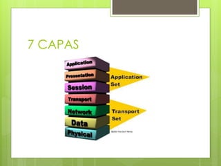 El documento describe el modelo de referencia de 7 capas de la comunicación, que abarca desde la capa física que involucra componentes de hardware y señales, hasta la capa de aplicación que ofrece servicios de red a aplicaciones de usuario. Cada capa tiene funciones específicas, como la transmisión de datos, el control de errores y la representación de información. Se detallan los componentes y funciones de cada capa, incluyendo ejemplos de protocolos utilizados.