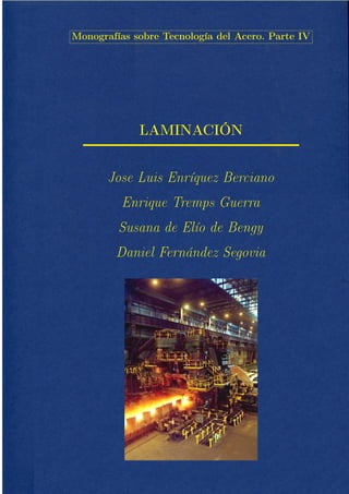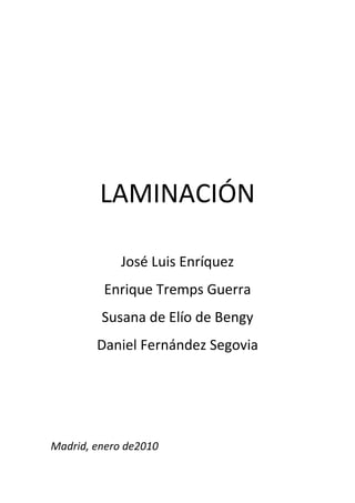Este documento describe el proceso y equipos de laminación. Explica que la laminación modifica las formas coladas en lingoteras o máquinas de colada continua a formas comerciales mediante la deformación plástica del metal entre cilindros. Describe los fundamentos de la laminación, las diferentes cajas de laminación y tipos de trenes de laminación según los productos iniciales y finales.