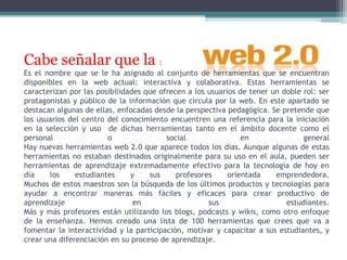 La Web 2.0 ofrece herramientas que permiten a los usuarios participar e interactuar en la web de manera colaborativa. Estas herramientas pueden ser efectivas para el aprendizaje de los estudiantes cuando son utilizadas correctamente por los profesores. Algunos beneficios de estas herramientas incluyen permitir el acceso a información de alta calidad de manera rápida y económica, así como facilitar la comunicación y el intercambio de conocimiento sin limitaciones de espacio o tiempo.