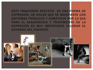 Este documento describe la depresión, un trastorno afectivo que se manifiesta con síntomas psíquicos y somáticos. Explica que para diagnosticar y tratar la depresión es importante considerar el entorno del paciente. Además, clasifica los diferentes tipos de depresión y sus síntomas, y analiza las posibles causas de este trastorno.