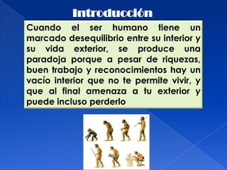 Este documento explora la paradoja entre el éxito exterior y el vacío interior, y define conceptos como liderazgo, poder y autoridad. Explica que el liderazgo consiste en influir sobre los demás para lograr objetivos comunes fomentando las relaciones humanas. Un líder debe escuchar, valorar y respetar a los demás, identificar y satisfacer sus necesidades a través del servicio y sacrificio para forjar su autoridad. El verdadero liderazgo requiere ejercerlo con gozo interior a través de la humildad, p