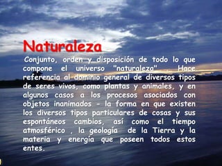 El documento trata sobre la naturaleza y sus componentes. Explica que la naturaleza incluye todo lo que compone el universo, como plantas, animales y procesos asociados con objetos inanimados. Describe los tres estados del agua y su importancia para la vida. También resume el ciclo hidrológico y la necesidad de proteger los ecosistemas y la biodiversidad que se encuentran en deterioro.