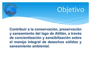 El documento describe una iniciativa para la conservación del lago de Atitlán a través de la concientización sobre el manejo de desechos sólidos y saneamiento ambiental. Se organizarán actividades lúdicas y educativas en diferentes municipios, involucrando a la sociedad civil y autoridades locales. La actividad principal, conocida como 'lancha azul', se llevará a cabo anualmente antes de Semana Santa para promover la unidad y la conciencia ambiental.