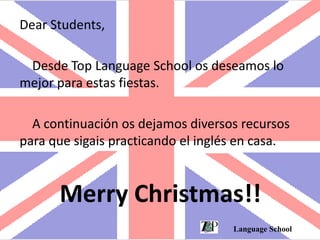 La escuela de idiomas Top Language School envió un correo electrónico a sus estudiantes deseándoles una feliz Navidad y proporcionándoles enlaces a recursos en línea para que continúen practicando el inglés durante las vacaciones, incluyendo videos sobre números, colores, objetos de la clase y figuras geométricas, así como el abecedario en inglés.