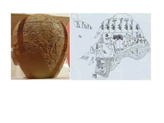 El documento proporciona información sobre la religión y la cultura del Antiguo Egipto. Habla del río Nilo y cómo sus crecidas anuales fertilizaban las tierras, permitiendo la agricultura y el desarrollo de la civilización egipcia. También describe algunos de los principales monumentos religiosos y funerarios egipcios como las pirámides y los templos de Karnak y Medinet Habu.