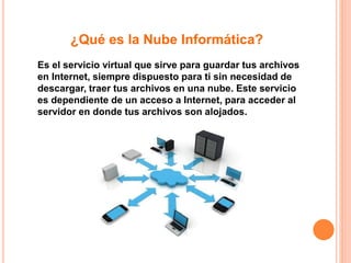 La nube informática permite almacenar archivos en servidores remotos a través de Internet en lugar de servidores locales. Ofrece ventajas como ahorro de costos al no requerir hardware, software o personal local, pero depende de una conexión a Internet constante y la seguridad de los proveedores. Algunas aplicaciones populares son Google Drive, Dropbox y Amazon Web Services.