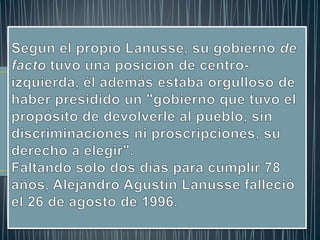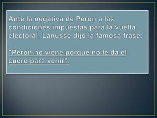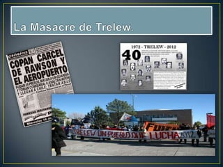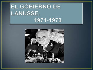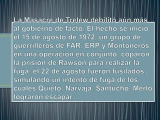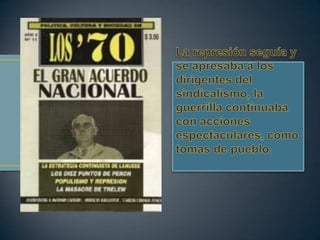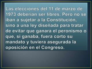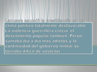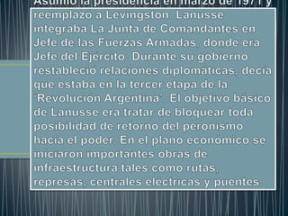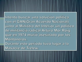 El documento analiza el contexto político en Argentina durante la presidencia de facto de Alejandro Agustín Lanusse, quien propuso el GAN en 1971 para restaurar el sistema democrático ante la crisis de la Revolución Argentina. También se menciona el conflicto entre peronistas y liberales, así como eventos de violencia política significativos, incluyendo la masacre de Trelew en 1972.