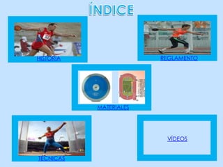 El lanzamiento de disco se originó en Grecia en el siglo VI a.C. y fue representado en la escultura "El Discóbolo". En la actualidad se compite a nivel olímpico desde 1896 para hombres y 1928 para mujeres. El disco debe lanzarse desde dentro de un círculo de 2.5 metros de diámetro siguiendo unas técnicas que incluyen la posición inicial, el giro y el lanzamiento final para obtener la mayor distancia posible.