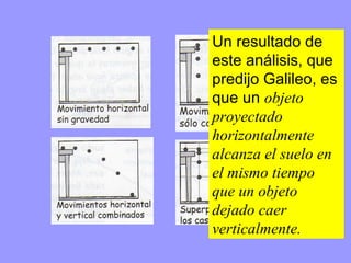 1) Galileo predijo que un objeto lanzado horizontalmente caerá al suelo en el mismo tiempo que uno dejado caer verticalmente.