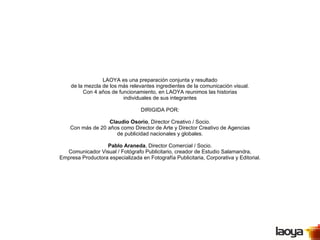 LAOYA es una agencia de comunicación visual con 4 años de experiencia. Está dirigida por Claudio Osorio, Director Creativo con más de 20 años de experiencia, y Pablo Araneda, Director Comercial y fotógrafo. Se especializan en el desarrollo de estrategias de comunicación y marcas para clientes como Metro, VTR, Farmacias Ahumada, Viña Valdivieso y más. También tienen experiencia en diseño editorial, de marca, web y publicidad.