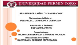 Este resumen por capítulos describe las lecciones sobre liderazgo de un curso. Cada capítulo cubre un tema como las definiciones de liderazgo, los paradigmas antiguos y nuevos, un modelo de liderazgo basado en el amor y servicio, y cómo crear un entorno que permita el crecimiento de los demás. El objetivo final es que los estudiantes apliquen estas lecciones para producir mejores resultados en sus propias vidas y en las de los demás.