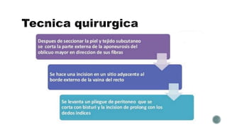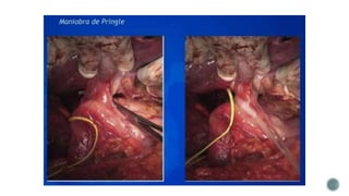 El documento describe diferentes aspectos de la cirugía abdominal, incluyendo incisiones quirúrgicas comunes, estructuras anatómicas abdominales, indicaciones para laparotomía, y maniobras quirúrgicas como la maniobra de Kocher.