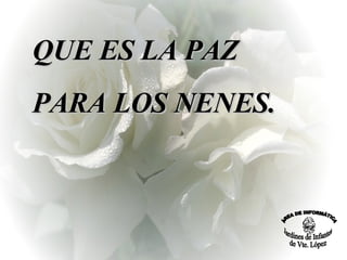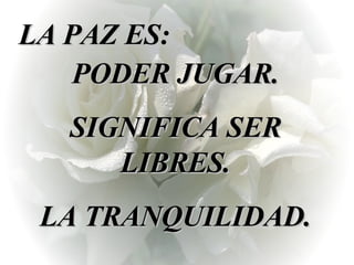 El documento resume lo que significa la paz para los niños y padres. Para los niños, la paz significa poder jugar libremente, sentir tranquilidad, perdonar a otros, relajarse, amar a las personas y estar contentos sin guerra. Para los padres, la paz significa ver a sus hijos crecer felices en un mundo de alegrías rodeados de sueños y metas que puedan cumplir con fortaleza y esperanza.