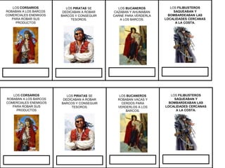 El documento describe tres tipos de piratas: los corsarios robaban barcos comerciales enemigos para robar sus productos, los piratas se dedicaban a robar barcos y conseguir tesoros, y los filibusteros saqueaban y bombardeaban localidades cercanas a la costa. Los bucaneros cazaban y ahumaban carne y también robaban vacas y cerdos para venderlos en los barcos.