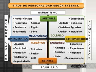 El documento habla sobre la personalidad y sus determinantes. Define la personalidad como el conjunto de rasgos distintivos de un individuo. Explica que la personalidad está influenciada por factores genéticos, sociales, familiares y culturales, así como por las emociones y el nivel de actividad. También describe dos modelos comunes para evaluar la personalidad: el Indicador de Tipos de Personalidad de Myers-Briggs y el Modelo de los Cinco Grandes, que identifica cinco dimensiones básicas de la personalidad.