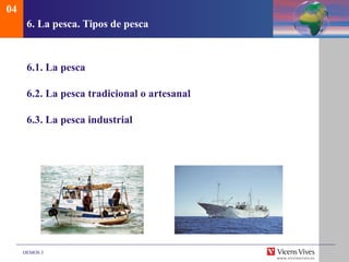 El documento describe los dos tipos principales de pesca: la pesca tradicional o artesanal, que se realiza cerca de la costa con métodos sencillos y tiene fines de autoconsumo, y la pesca industrial, que busca obtener grandes volúmenes de captura y requiere de recursos tecnológicos y portuarios avanzados. También señala los principales problemas de la pesca como la sobreexplotación de los recursos y la contaminación de las aguas, y la necesidad de adoptar un modelo sostenible de explotación que proteja el med