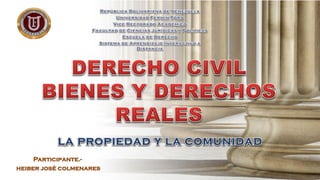 El documento trata sobre la definición y características de la propiedad y la comunidad. Define la propiedad como el derecho de usar, gozar y disponer de una cosa de manera exclusiva, con las limitaciones establecidas por la ley. Explica que la comunidad es la situación en la que varias personas ejercen derechos de propiedad sobre un bien de manera indivisa, con cada persona como titular de una cuota. También cubre temas como la propiedad horizontal, expropiación y reforma agraria.
