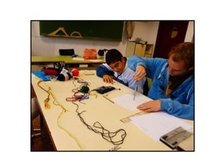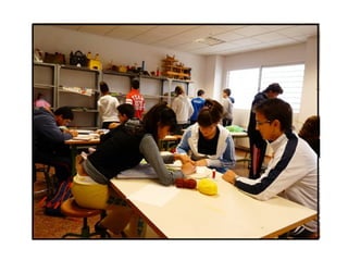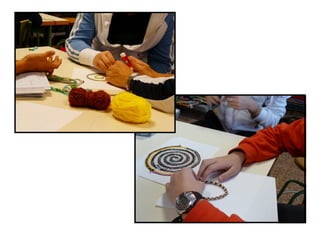Este documento describe cómo los estudiantes usaron restos de lana y abalorios para hacer pulseras decorativas con espirales, óvalos y ovoides, siguiendo la técnica de trenzar. Primero dibujaron las curvas técnicas, luego trenzaron las lanas de colores, y finalmente pegaron las lanas trenzadas en los trazados geométricos para decorar las ventanas del aula. El autor indica que continuarán engalanando el aula a lo largo del curso.