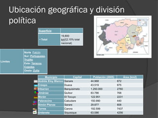 Este documento proporciona información sobre el estado de Lara en Venezuela. Ubicado en el centro-norte del país, limita con los estados de Falcón, Portuguesa, Yaracuy, Cojedes y Zulia. Su economía se basa principalmente en la agricultura, incluyendo el cultivo de caña de azúcar, café, papas y tomates. Algunos de sus símbolos son el árbol de semeruco, el cardenal y la bandera y escudo del estado. También cuenta con parques nacionales, sitios turístic