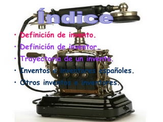 Este documento define los términos "invento" e "inventor", describe brevemente la trayectoria típica de un invento desde su creación hasta su forma definitiva, y presenta algunos inventos e inventores españoles como el futbolín, el chupa-chups, el submarino y la fregona. También menciona otros inventos importantes como el ordenador, la máquina de vapor, la televisión, el piano, el teléfono y el automóvil junto con sus respectivos inventores.