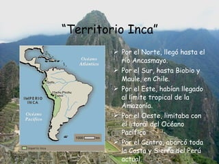 Los Incas tuvieron un gran imperio que se extendió desde el río Ancasmayo en el norte de Perú hasta el río Maule en el sur de Chile, abarcando territorios en los actuales Ecuador, Perú, Bolivia, Chile y Argentina. Su historia comenzó en el año 1200 d.C. en Cuzco y alcanzó su máximo esplendor bajo el mando de Tupac Inca Yupanqui en el siglo XV. La sociedad inca se basaba en el ayllu, grupos de familias emparentadas que compartían la tierra y