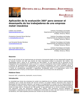 Este documento describe la aplicación de una evaluación de 360 grados a los trabajadores de una empresa metalmecánica para conocer su desempeño. Se identificó al mejor trabajador para definir las competencias requeridas. Luego se desarrolló un cuestionario para medir estas competencias, el cual fue aplicado a los trabajadores y sus evaluadores. Finalmente, los resultados fueron analizados para proveer retroalimentación y mejorar el desempeño.