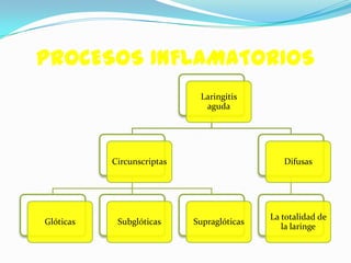 Este documento presenta una descripción detallada de diferentes tipos de laringitis agudas y crónicas, así como de patologías de pliegues vocales y tumores malignos de laringe. Describe las características clínicas, diagnósticas y tratamiento de cada condición.
