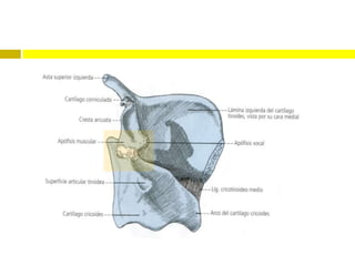 La laringe está formada por cartílagos principales como el tiroides, cricoides y aritenoides, y cartílagos secundarios como los corniculados y cuneiformes. Posee músculos intrínsecos como el cricotiroideo y aritenoideo, y extrínsecos como el estilohioideo. La mucosa forma el vestíbulo, ventrículos y glotis. La laringe permite funciones como la respiración a través de la glotis y la fonación mediante la vibración de las cuerdas vocales entre