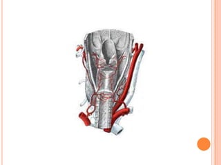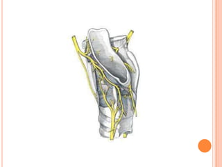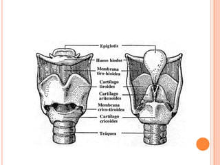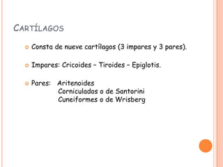 La laringe es un órgano situado en la parte superior del cuello que une la faringe con la tráquea. Está formada por cartílagos, ligamentos y músculos. Sus funciones incluyen la fonación, proteger las vías respiratorias durante la deglución, y regular la respiración. La laringe contiene cuerdas vocales que vibran para producir sonidos durante el habla.