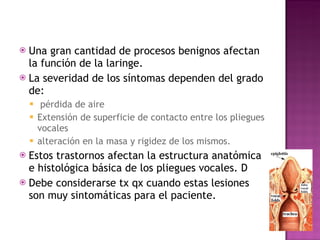 1. Los procesos benignos más comunes de la laringe incluyen nódulos, quistes, pólipos y edema de Reinke, los cuales pueden causar disfonía u obstrucción.