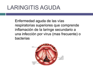 Este documento describe la laringitis aguda, una enfermedad inflamatoria de las vías respiratorias superiores causada principalmente por infecciones virales. Puede presentarse de forma localizada o difusa, y con frecuencia se complica con infecciones bacterianas. Los síntomas incluyen dolor de garganta, tos, disfonía y dificultad para respirar. El diagnóstico se realiza clínicamente y mediante laringoscopia. El tratamiento consiste en medidas de soporte e hidratación, y antibióticos sólo si hay una in