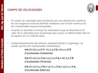 Este documento presenta conceptos clave sobre el campo de velocidades, aceleraciones, deformaciones y vorticidad en mecánica de fluidos. Explica que el campo de velocidades describe la velocidad de cada partícula en función de las coordenadas espacio-temporales. Define la aceleración como el cambio en la velocidad con respecto al tiempo y presenta fórmulas para calcularla. También cubre conceptos como velocidad de deformación, distorsiones en un fluido y cómo calcular la vorticidad. Finalmente, proporciona un ejercicio de