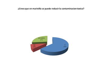 Este documento presenta los resultados de dos encuestas realizadas en Marinilla sobre la presencia de residuos tóxicos y las posibilidades de reducir la contaminación tóxica. En la primera encuesta, el 73.33% de los encuestados creen que hay residuos tóxicos, mientras que en la segunda el 63.33% creen que se puede reducir la contaminación tóxica.