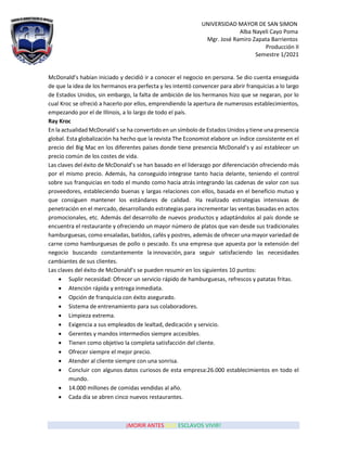 Este documento describe las claves del éxito de dos empresas exitosas: McDonald's y Apple. Para McDonald's, las claves incluyen ofrecer comida rápida a bajo precio de manera eficiente, tener un sistema de franquicias exitoso, y mantener altos estándares de calidad y servicio al cliente. Para Apple, las claves son su fuerte imagen de marca, los productos innovadores lanzados por Steve Jobs, su atractivo diseño, y su base de fans leales. También describe brevemente el éxito de Microsoft basado en su capacidad de innovación