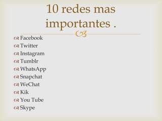 Este documento resume 10 de las redes sociales más importantes: Facebook, Twitter, Instagram, Tumblr, WhatsApp, Snapchat, WeChat, Kik, YouTube y Skype. Proporciona una breve descripción de cada plataforma, incluyendo sus funciones principales y algunos datos clave sobre su creación y número de usuarios.