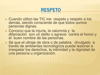 Este documento presenta 10 comportamientos digitales clave: respeto, libertad, identidad, integridad, intimidad, autonomía, calidad de vida, cuidado y acompañamiento, respeto por la ley y derechos de autor. Cada comportamiento se define brevemente en uno o dos puntos con el objetivo de promover el uso responsable y ético de las tecnologías de la información.