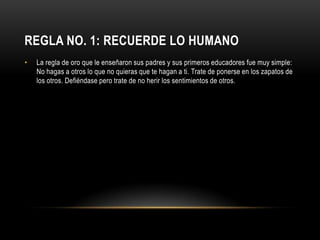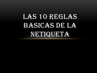 Este documento presenta 10 reglas básicas de netiqueta. Algunas de las reglas principales son: respetar los estándares de comportamiento en línea como en la vida real, observar antes de participar en nuevos sitios, respetar el tiempo y ancho de banda de los demás, compartir conocimiento, y respetar la privacidad de los demás. El documento enfatiza la importancia de tratar a los demás en línea con cortesía y consideración.