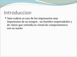 Sam Walton fundó Walmart y se convirtió en uno de los empresarios más exitosos gracias a su fuerte compromiso con su visión, su ética de trabajo y su enfoque en satisfacer completamente a los clientes. Motivaba a sus empleados compartiendo ganancias con ellos, creando un ambiente de trabajo divertido, y escuchando sus ideas. Su éxito se debió a minimizar costos, ofrecer bajos precios y excelente servicio al cliente.