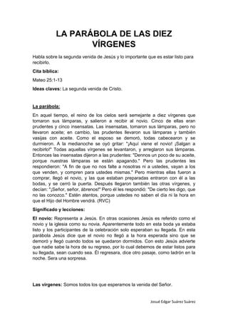 La parábola de las diez vírgenes describe la necesidad de estar preparados para la segunda venida de Jesús, ya que nadie sabe el día ni la hora. Las cinco vírgenes prudentes llevaron suficiente aceite para sus lámparas, mientras que las cinco insensatas no lo hicieron y no pudieron entrar a la boda cuando llegó el novio. La parábola enseña que debemos aceptar a Jesús como Salvador y vivir de acuerdo a Su Espíritu para estar listos cuando Él regrese.
