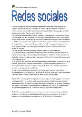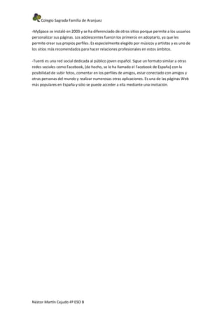 Este documento describe las redes sociales, su origen y evolución. Explica que las redes sociales permiten a las personas conectarse con amigos y hacer nuevas amistades de manera virtual. Se remontan al menos a 1995 con la creación de classmates.com, y su popularidad creció rápidamente en la década de 2000. Las redes sociales más populares mencionadas son Facebook, Twitter, MySpace y Tuenti.