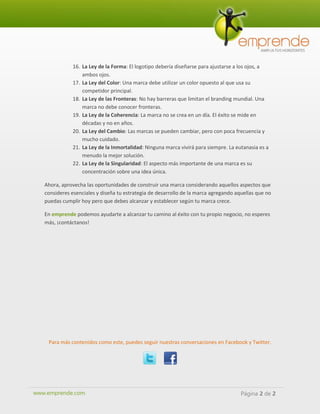 El documento resume las 22 Leyes Inmutables de la Marca propuestas por Al Ries y Laura Ries, las cuales sugieren que una marca que las cumpla está destinada a obtener mayor posicionamiento y éxito. Estas leyes incluyen principios como que el poder de una marca disminuye a medida que se amplía su enfoque, que una marca se fortalece al concentrarse, y que una marca debe apropiarse de una palabra en la mente del consumidor. El documento también recomienda que las marcas consideren estas leyes al conformarse y dise