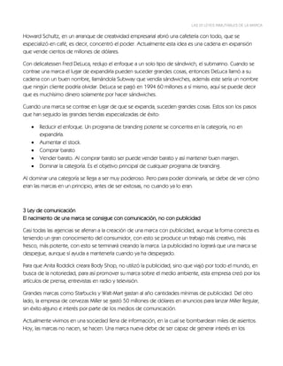 1) Las 22 Leyes inmutables de la marca describen principios clave para el desarrollo exitoso de marcas, incluyendo la necesidad de concentrar el enfoque de una marca en lugar de expandirla, apropiarse de una palabra en la mente del consumidor, y promover la categoría en lugar de la marca individual.
