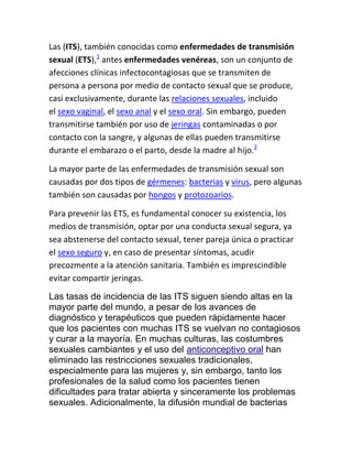 Este documento describe las enfermedades de transmisión sexual (ETS), sus causas, medios de transmisión y formas de prevención. Las ETS son infecciones que se transmiten principalmente a través del contacto sexual e incluyen bacterias, virus, hongos y protozoos. Para prevenirlas, es importante practicar el sexo seguro mediante el uso de preservativos, tener una sola pareja sexual o abstenerse de las relaciones sexuales. Las tasas de ETS siguen siendo altas a pesar de los avances médicos, debido a factores como el