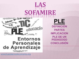 Este documento describe las partes de un Entorno Personal de Aprendizaje (PLE), incluyendo herramientas para leer, reflexionar, y compartir información. También discute las implicaciones de los PLE para los pedagogos y concluye enfatizando la importancia de familiarizar a los estudiantes con el aprendizaje en línea.