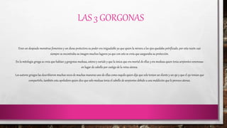 Las tres gorgonas de la mitología griega eran Medusa, Esteno y Euríale. Medusa era la única mortal y tenía serpientes en lugar de cabello debido a un castigo de Atenea. Esteno tenía una gran fuerza física y mental, mientras que Euríale era la mayor y más compasiva de las tres.