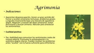 Este documento presenta las 38 Flores de Bach, flores silvestres utilizadas por el médico homeópata Edward Bach para tratar diversas alteraciones emocionales. Describe brevemente cada flor, indicando las emociones o problemas que trata y la cualidad positiva que promueve.